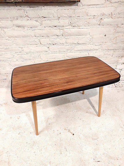 Siisti ja jämäkkä teak pintainen sohvapöytä. Klassinen malli, jossa erikoisuutena jatkopala, joka liukuu tarvittaessa pöydän alta tuoden 35cm lisää laskupintaa!