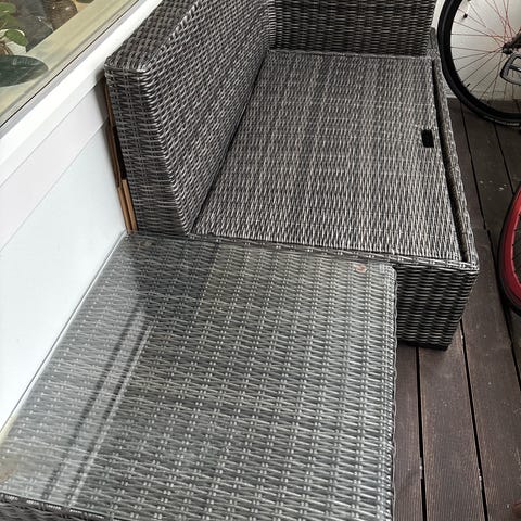 Lasitetulla parvekkeella käytössä ollut kolmen istuttava rottinkinen ulkosohva. Koristetyynyt ja viltit eivät kuulu mukaan.