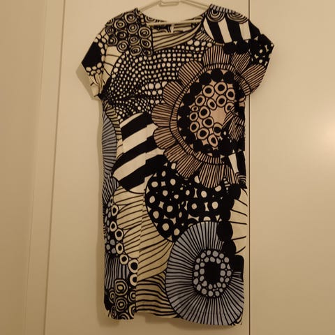 Marimekko söpö mekko koko 40. Kainalo kainalo 50cm ja pituus 88cm. Taskut, vuori, takana vetoketju, 3/4 hihat.