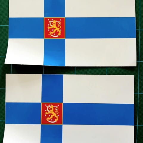 Kuvan hienossa kunnossa olevat Suomi tarrat. H 15cm, 12x18cm noin. Sisältää postikulut