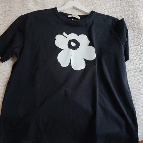 Marimekko Unikko paita mustassa värissä, naisten koko M. Materiaali ja hoito-ohjeet löytyvät tuotteen pesulapusta. Paita on kuvioitu Unikko-kuosilla ja siinä on 3/4-hihat.