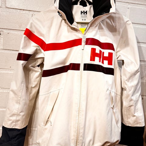 Jotain pientä käytönjälkeä, valkoiset saumat vetoketjuissa kellastuneet. Sisäpuolella verkkovuoressa pieni repeämä, näkyy kuvassa