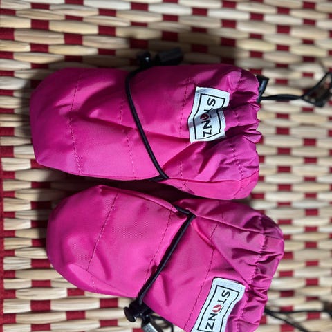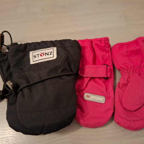 Hanskat saadaan asetettua helposti lapsen käsiin, koska niissä on leveä suu. Hanskoissa on kiristettävät kuminauhat, jotka pitävät hanskat tukevasti lapsen käsissä.