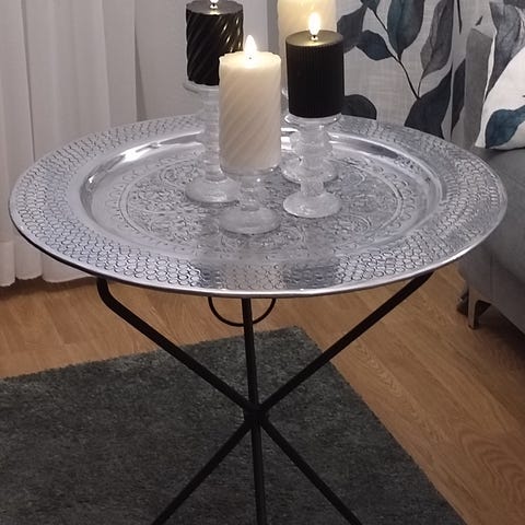 Kätevä metallinen tarjotinpöytä, tarjotin sinkittyä peltiä. Kokoontaitettava jalka on terästä.