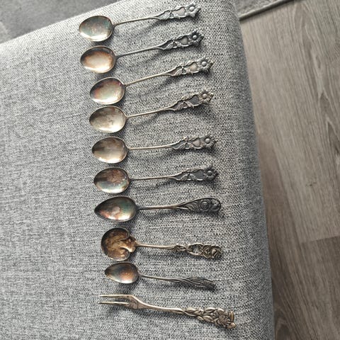 Setistä hukkaantunut kolme veistä, muutoin 6kpl haarukoita, isoja lusikoita, pikkulusikoita ja kahvilusikoita sekä muutama eri sarjaa oleva kahvilusikka. En oo yrittänyt putsata näitä joten myydään siinä kunnossa kuin ovat.. mulla ei oikeastaan ole ajatusta näiden arvosta jos sitä edes on joten tarjoa ja hae pois?