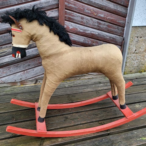 Keinu hevonen . Korkeus selkään 44cm. Korkeus päähän 63cm. Leveys 75cm ×35cm . Nouto