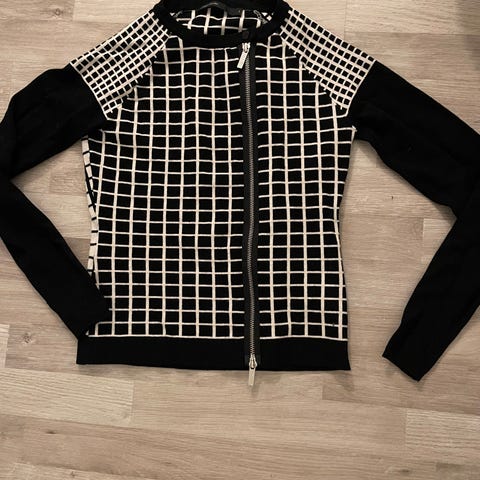 Valkoinen Karen Millen neule mustavalkoisella etuosalla, 3/4 hihat läpikuultavaa kangasta. Vähän käytetty. Pehmeää neulosta.