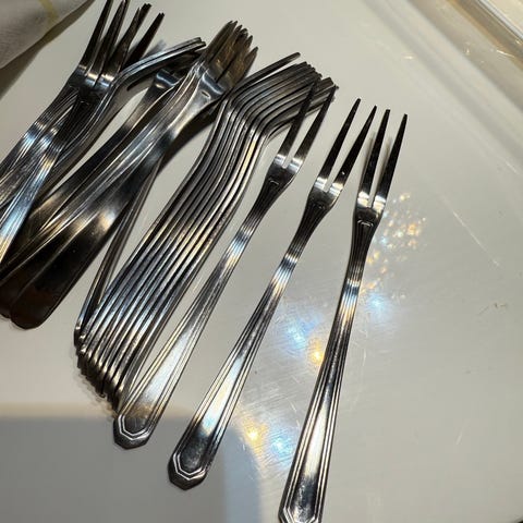 Norjassa valmistetut tinasta ja ruostumattomasta teräksestä valmistetut salaattiottimet. Nämä ovat osa "Kongetinn"-sarjaa, joka kuvaa viikinkiajan norjalaisia kuninkaita. Hyvässä kunnossa, pinnassa on joitakin käytön aiheuttamia naarmuja. Vintage-esineitä 1970-luvulta. Pituus 22 cm. Hp. 20€ + pk