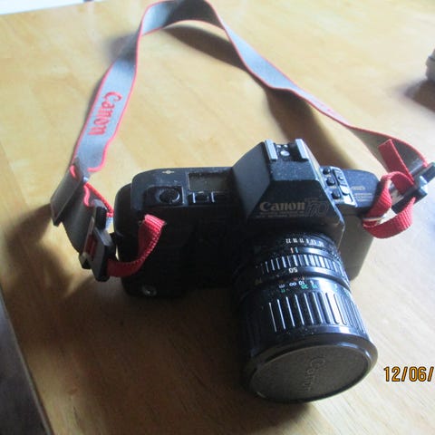 Myydään kuvan mukainen Canon T70 Filmijärjestelmäkamera. Käyttöohjeet mukana ja kamera laukku. Paristo luukun kohdalla on pieni halkeama, mutta ei haittaa käytännössä, näkyy kuvassa.