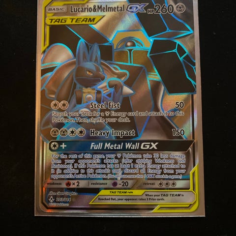 Pokémon Trading Card Lucario EX, kortti, esittää Lucario-hahmoa. Kortissa on kolme hyökkäystä: Missile Jab (30 vahinkoa), Corkscrew Smash (60 vahinkoa) ja Somersault Kick (100 vahinkoa). Kortin koko on standardi keräilykorttikoko, ja se on tarkoitettu Pokémon-korttipelin pelaajille ja keräilijöille.