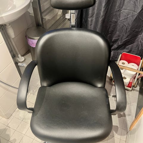 Mustapintainen Parturin työtuoli säädettävällä korkeudella ja jalkatuella