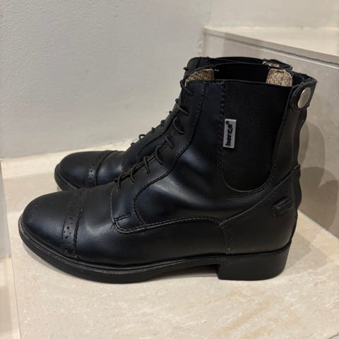 Käytetyt, yhä hyväkuntoiset ratsastusnilkkurit / ratsastuskengät. Toisessa kärjessä pieni naarmu.