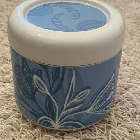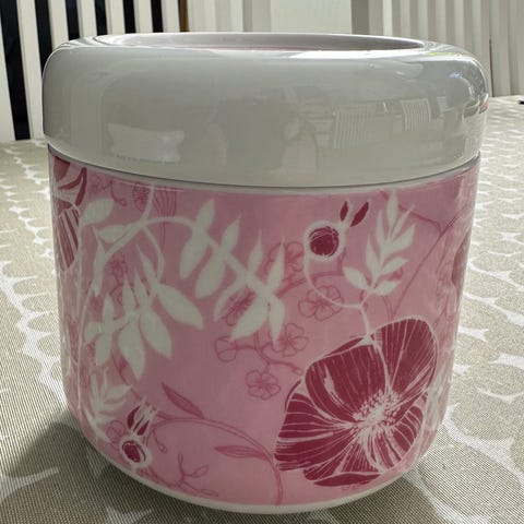Arabia Keto erittäin siisti säilytysrasia, jossa vaaleanpunainen kukkakuvioinen kansi ja valkoinen runko. Sopii keittiövälineiden tai muiden pienten esineiden säilytykseen.