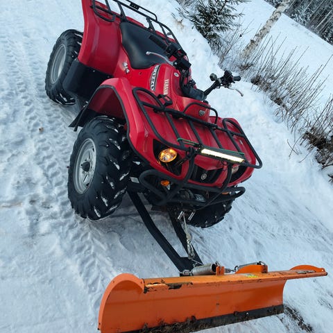- Mukaan kärry ja hyvä lumiaura pikakiinnityksellä.