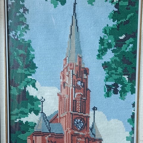 Kaunis ristipistotyö vaaleansinisellä pohjalla. Herkkä luontoaihe jossa järvi, metsä, heinikko. Vuosiluvuksi kirjailtu 2007.