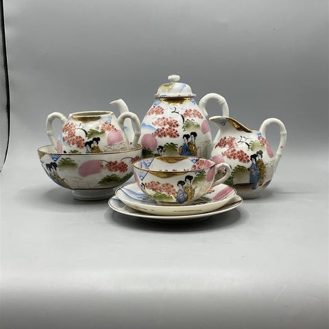 Kauniit vintage-teekupit ja lautaset, joissa on monivärinen japanilainen maisemakuvio. Setti sisältää viisi kuppia ja kuusi tassia, joissa kaikissa on yhtenäinen kuviointi ja punainen reunus.