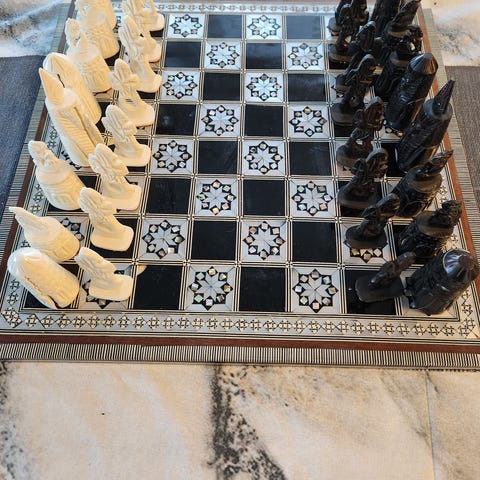 Shakkilauta ja 2 pussia nappuloita, puuta ja kivijäljitelmä pinta.
