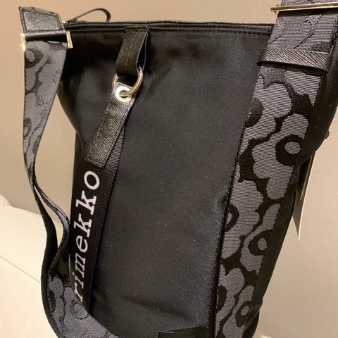 Laukussa on kolme osastoa: yksi vetoketjulla suljettava ja kaksi avointa osastoa, joista toisessa on sisätasku. Laukussa on säädettävä olkahihna. Etupuolelle on kiinnitetty Marimekko-avaimenperä ja takapuolella on yksi avoin tasku, joka sulkeutuu magneettinapilla.