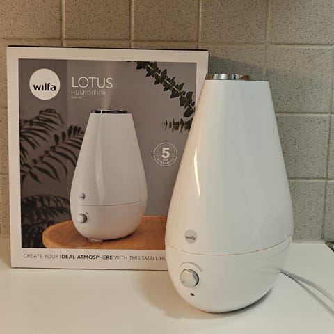 Compact white Deerma F301 ultrasonic humidifier with the distinctive red, ribbed top. 2.5 L tank, single power button with light ring. Works well, good condition, no issues.
