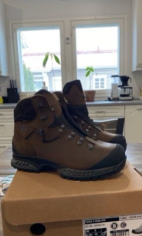 Hanwag Tatra II vaelluskengät ruskeaa nahkaa. Kengissä on mustat nauhat ja metalliset nauhanpidikkeet. Sisävuori on vaaleanharmaa ja musta, kengät ovat korkeavartiset ja sopivat ulkoiluun ja vaellukseen. Ihan käyttämätön.