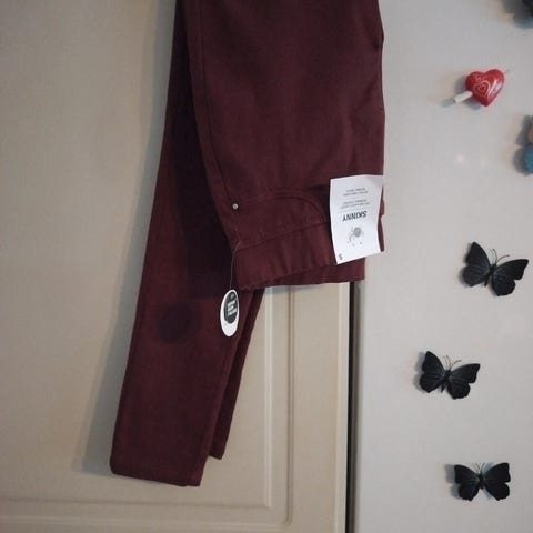leggingsit naisille, koko S. Väriltään violetti. Materiaalina 65% viskoosi, 30% polyamidi ja 5% elastaani. Skinny-mallinen housut, joissa koristeelliset napit lahkeen alaosassa.
