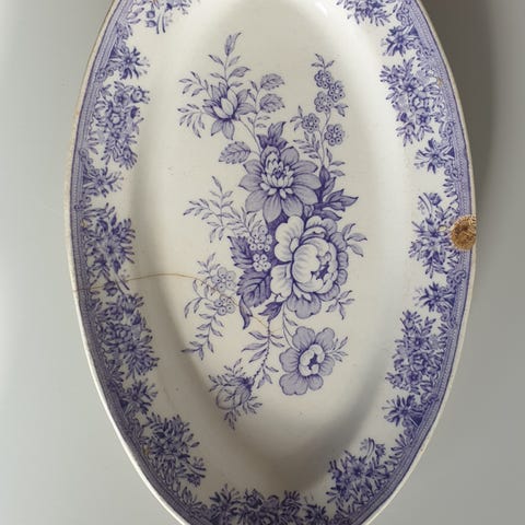 Arabia Fasaani suuri tarjoiluastia. Antiikkia, leima v. 1893-1917. Halkeamia, lohkeamia ja krakeloitunut. N. 30,5 cm x 24,5 cm x 6,3 cm.