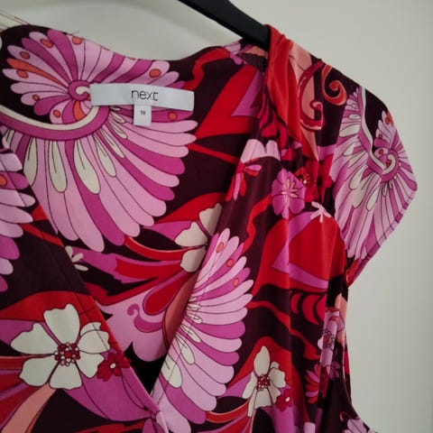 Lyhyt mekko, jossa kaulus, madalletut olkapäät ja pitkät hihat. Kietaisumallinen etukappale, jonka toisessa sivussa solmittavat leveät nauhat ja toisessa kapeat solmittavat piilonauhat. Vyötärön rypytetty sauma luo poimutettua vaikutelmaa. Ei vuoria. Viskoosi/polyamidi