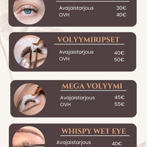 Tarjolla ripsienpidennykset ja jalkahoidot, ja kulmien värjäys ja muotoilu