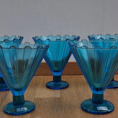 Nuutajärvi Kaj Franck kaadin 5601 ja 6 kpl juomalaseja. Sininen väri. Hyvässä kunnossa, ei säröjä.