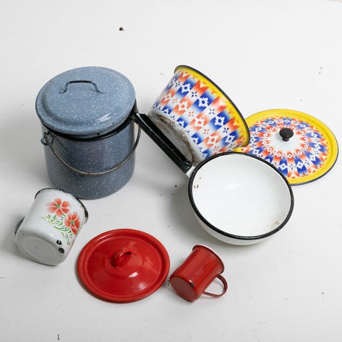 Lasten emaliastioita ja säilytyskorit. Mittasuhteet näkee kuvan lusikoista, jotka on oikeita ruokalusikoita.
