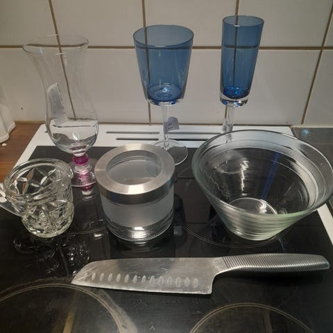 Sekalainen setti kaikenlaista. Kattiloita, vuokia, pelikortteja, koriste-esineitä, kankaita ja pitsejä. Kävelykeppejä.