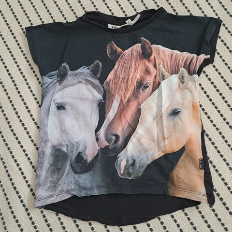 Yleisilmeeltään siisti trikoopaita - toisesta hihasta kuitenkin paikattu reikä ja toisessa näyttää olevan ehkä liimaa(?). Muuten paita ja kangas hyväkuntoinen. Tuoksuton pesu.