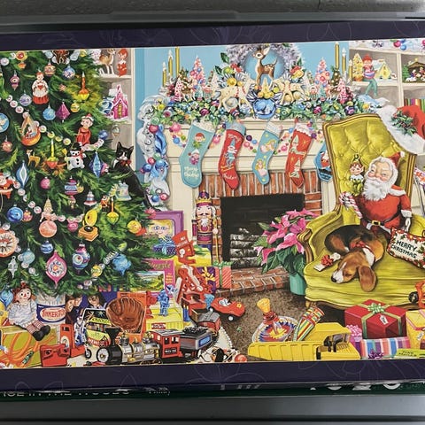 1000 palan Ravensburgin joulupalapeli. Rakennettu kerran ja kaikki palat tallella.