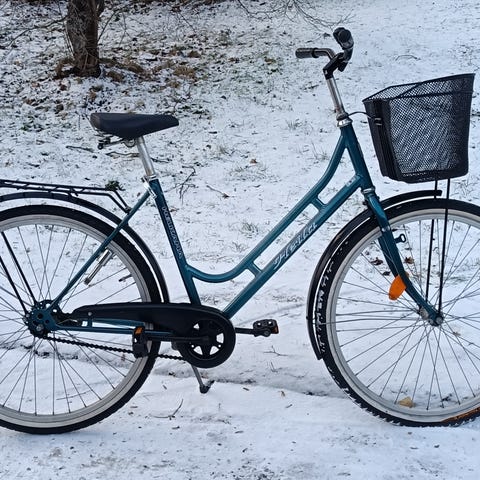 Talvipyöräilyyn sopiva naistenpyörä. Etu- ja takapyörissä on nastarenkaat. Hyväkuntoinen ja huollettu.