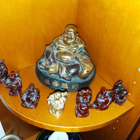 Myydään pronssin värinen Buddha-patsas, materiaali lienee jotain metallia.