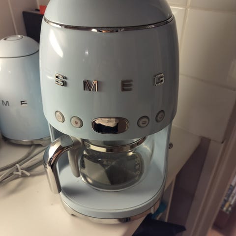 SMEG kahvinkeitin mustalla värillä ja lasikannulla. Kahvinkeitin on valmistettu kestävästä materiaalista ja sen muotoilu on klassinen. Keitin puhdistettu säännöllisesti,laitteessa merkkivalo mikä ilmoittaa milloin puhdistus on ajankohtainen. Vesi mitattu säiliöön aina erillisellä kannulla. Sijaitsee Kanervalassa.