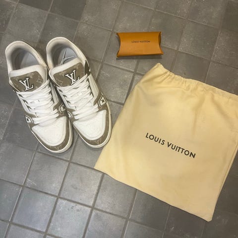 Tosi vähälle käytölle jääneet harvinaiset LV-tennarit. Yhdessä kuvassa näkyy, että toisesta kengästä puuttuu koriste takaa vetuketjusta, mutta liikkeen mukaan saa vara-osana. LV toiset nauhat vielä paketissa.
