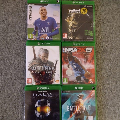 Myydään seuraava paketti. Kuvassa olevat pelit sekä konsoli ohjaimella.