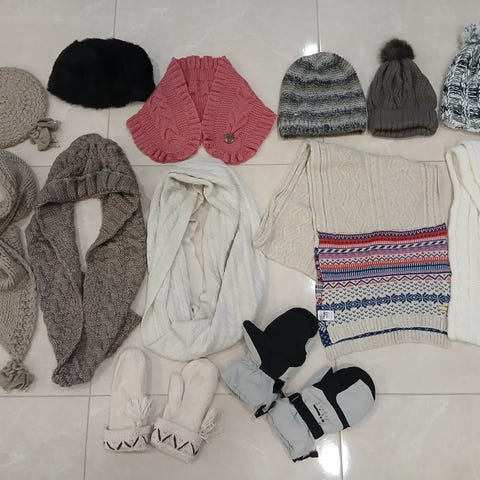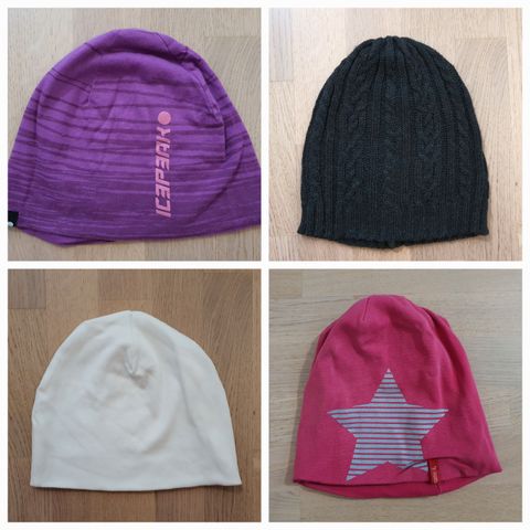 Iso kasa erilaisia pipoja muutamat tumput, huivi. Mukana myös uudenveroinen heijastava pipo, hello kitty pipo ja Lapaset. Huivissa muutamissa kohdissa langan nousu. Kaikki yhteensä 10€
