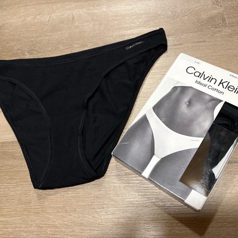 Sivussa taskut, vyötäröllä Calvin Klein -logolla musta kuminauha, suorat lahkeet. Mukavaa sileää puuvillakangasta, miellyttävä iholla. Koiratalous.