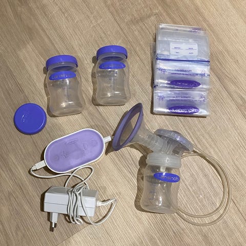 Lansinoh sähköpumppu, uutena ostettu, erittäin vähän käytetty ja toimiva. Mukaan käyttämätön tuttipullo ja viisi maitopussia sekä mukana tulleet, käyttämättömät pumpun varaosat.