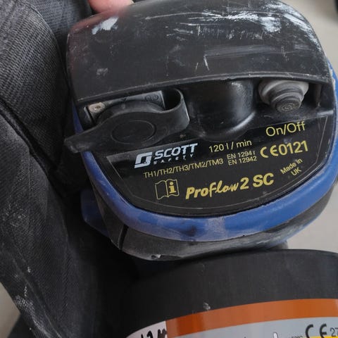 Tuommoinen suojamaski niskaan tulevalla puhaltimella.