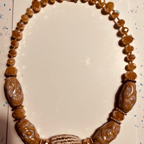 Pienistä lasihelmistä tehty kaulakoru, viininpunaisia ja kultaisia helmiä. Yksi lasihelminauha katkennut ja siima näkyy irtonaisena, sen voi solmia kiinni tai poistaa kokonaan. En ole käyttänyt tätä kertaakaan.