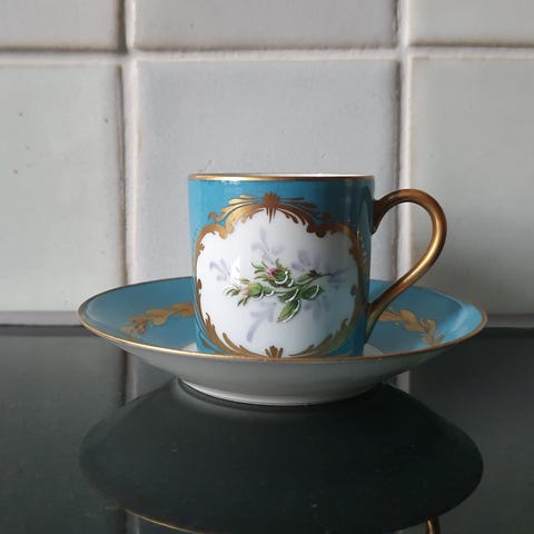 limoges, limoges castel, kahvikuppi, posliini, ranskalainen posliini, kultakoriste, kahviastiasto, antiikki, vintage, keräily, sininen, kultareuna, 22k, teekuppi, kahvisetti, koristeastiasto, lomonosov, vileroy