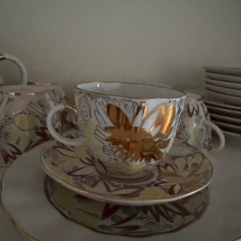 Muut kupit ja aluslautaset ovat erinomaisessa kunnossa – ei käytön jälkiä, posliini ja kultaus kuin uudet.