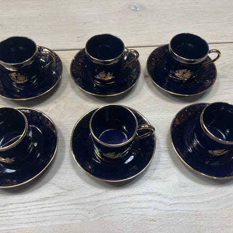Syvän tummansininen kobalttiväri ja 22 karaatin kultakoristeet tekevät siitä näyttävän sisustuselementin. Keskellä romanttinen kuvio klassiseen Limoges-tyyliin.