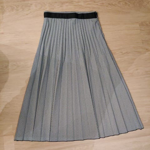 Hame on mustavalkoinen ja valmistettu laskeutuvasta kankaasta (joka ei rypisty helposti). Vyötäröllä on kiristys/koristenauha ja napit koko hameen pituudelta.