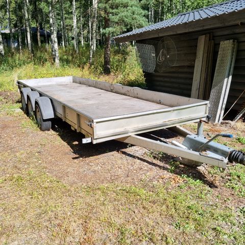 Jarrullinen peräkärry kestävällä kuomulla, lehtijouset, kahdet renkaat, v. 2003. Katsastettu syyskuussa 2025. Lavan pituus 3230mm ja leveys 1510mm, oma paino 340kg, suurin sallittu kokonaismassa 1800kg.
