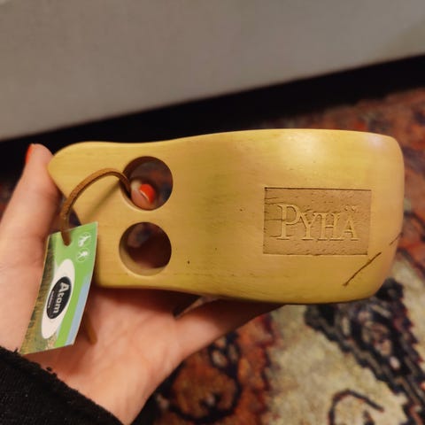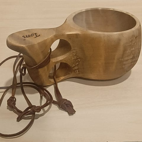 Myydään pieni 0,5 dl puinen kuksa, snapsi kokoinen. Nahkainen kaulanauha.