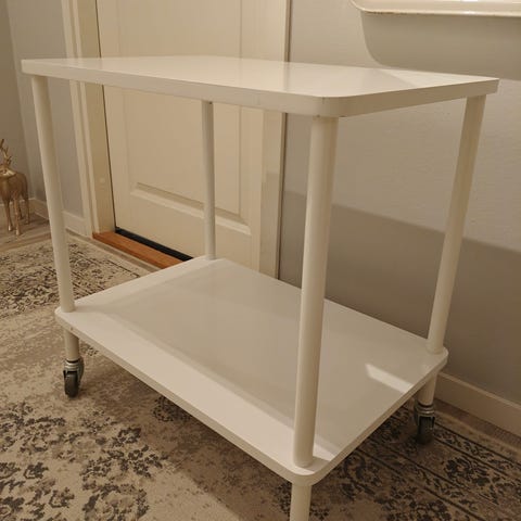 Beige puinen tv taso,jossa pyörät
